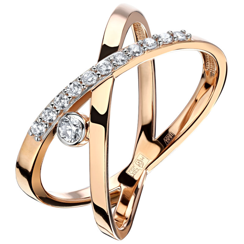 Кольцо из красного золота 585 пробы с фианитами. Изящный дизайн, представляющий собой переплетающиеся линии, украшен россыпью сверкающих камней, добавляющих блеск и роскошь.