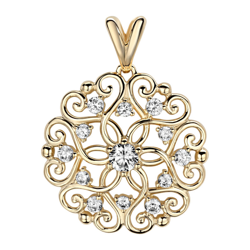 Декоративная подвеска из желтого золота 585 пробы с фианитами. Идеальный глянец золота одинаково хорошо сочетается как с повседневными образами, так и с роскошными нарядами. Самые смелые решения дизайнеров воплощаются в современных украшениях.