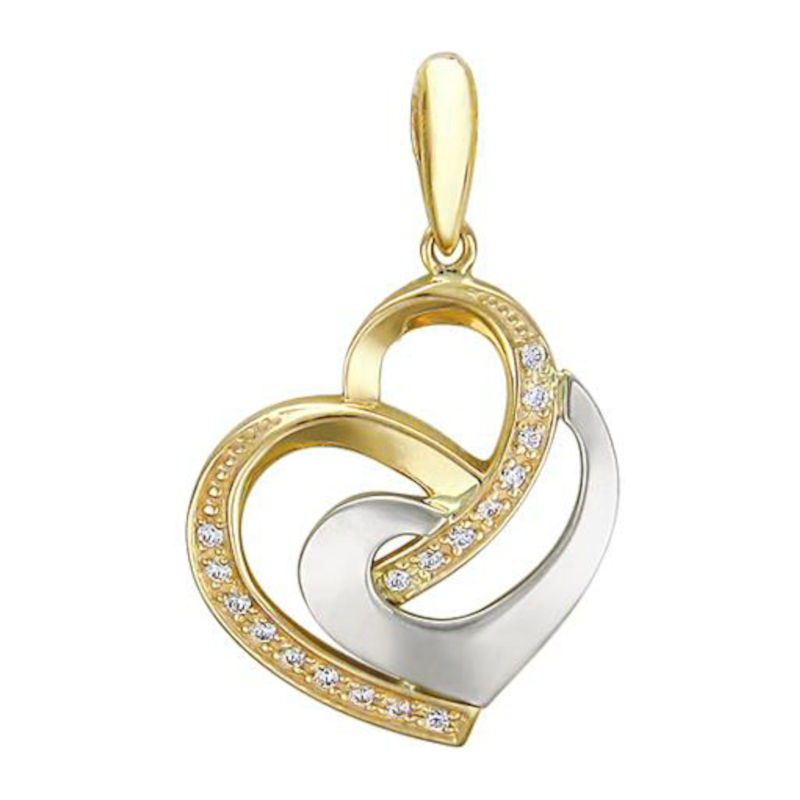 Элегантная подвеска из комбинированного золота 585 пробы с фианитами 01П161486Ж универсальна и притягательна своей изящностью. Кулон представляет собой два переплетенных сердечка — одно из желтого золота, украшенное россыпью сверкающих фианитов, и второе — из белого золота. Такой дизайн придает украшению романтичную изюминку и символизирует любовь и гармонию.
