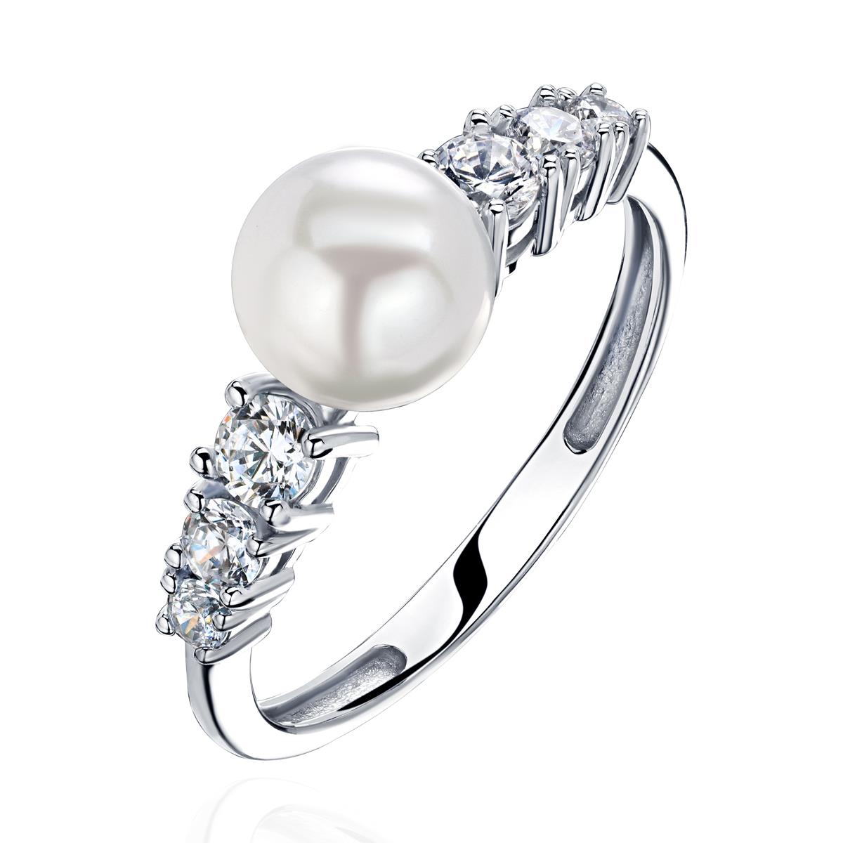 Кольцо из белого золота 585 пробы с фианитами и жемчугом 01К3213113-1