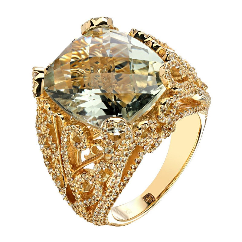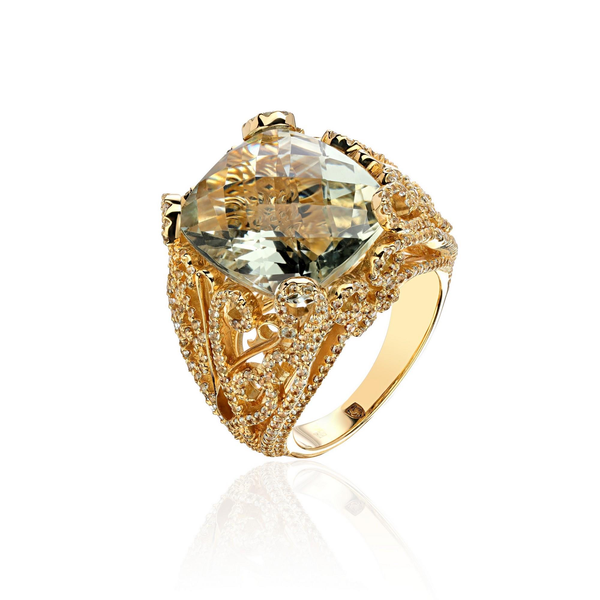 Кольцо из желтого золота 750 пробы с сапфирами и празиолитом 01К548330-2