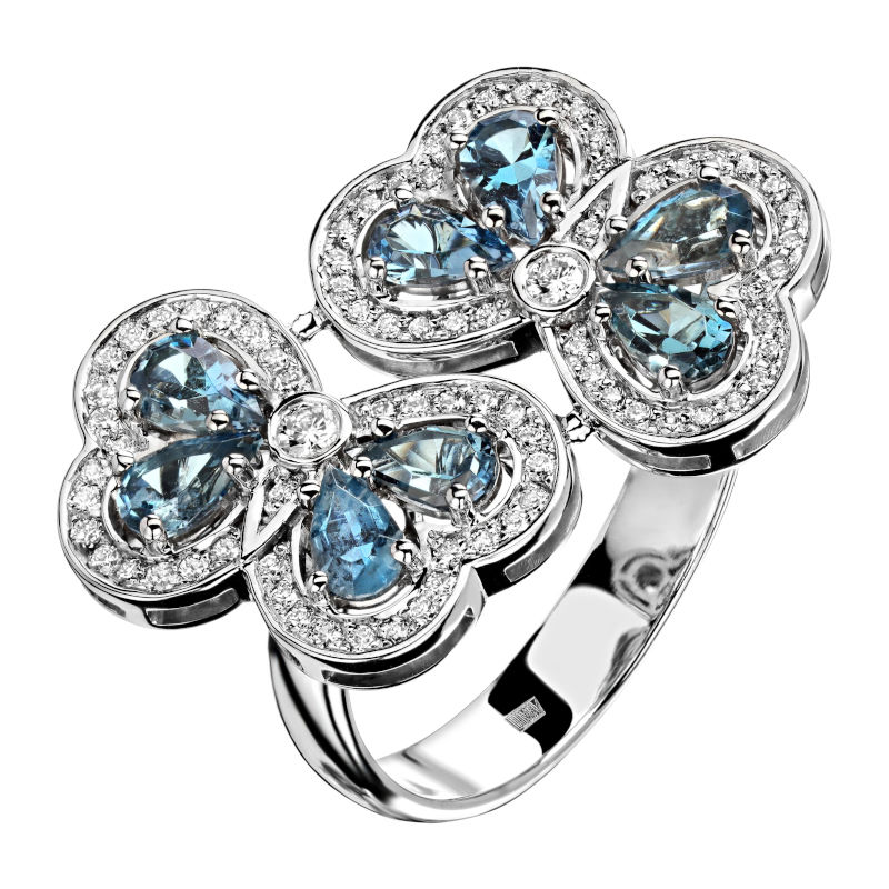 Кольцо из белого золота 585 пробы с бриллиантами и аквамаринами 01К6214093-5