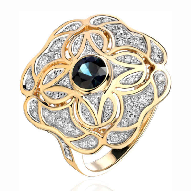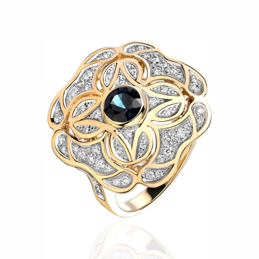 Кольцо из желтого золота 750 пробы с бриллиантами и сапфиром 01К6312105-3