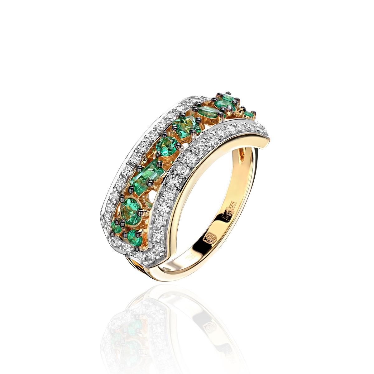 Кольцо из желтого золота 750 пробы с бриллиантами и изумрудами 01К6314557-1