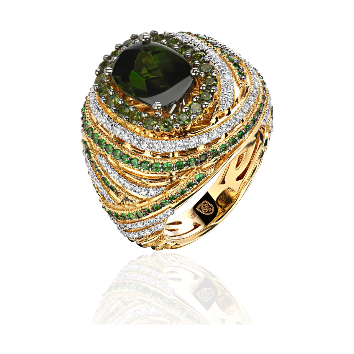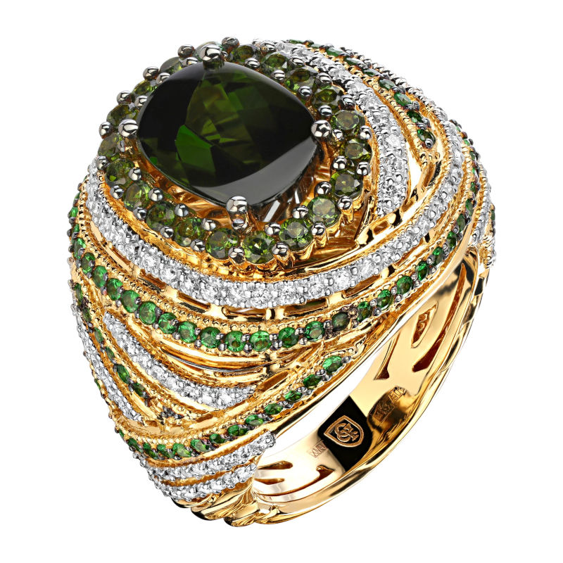 Кольцо из желтого золота 750 пробы с бриллиантами, тсаворитами и турмалинами 01К648331-3