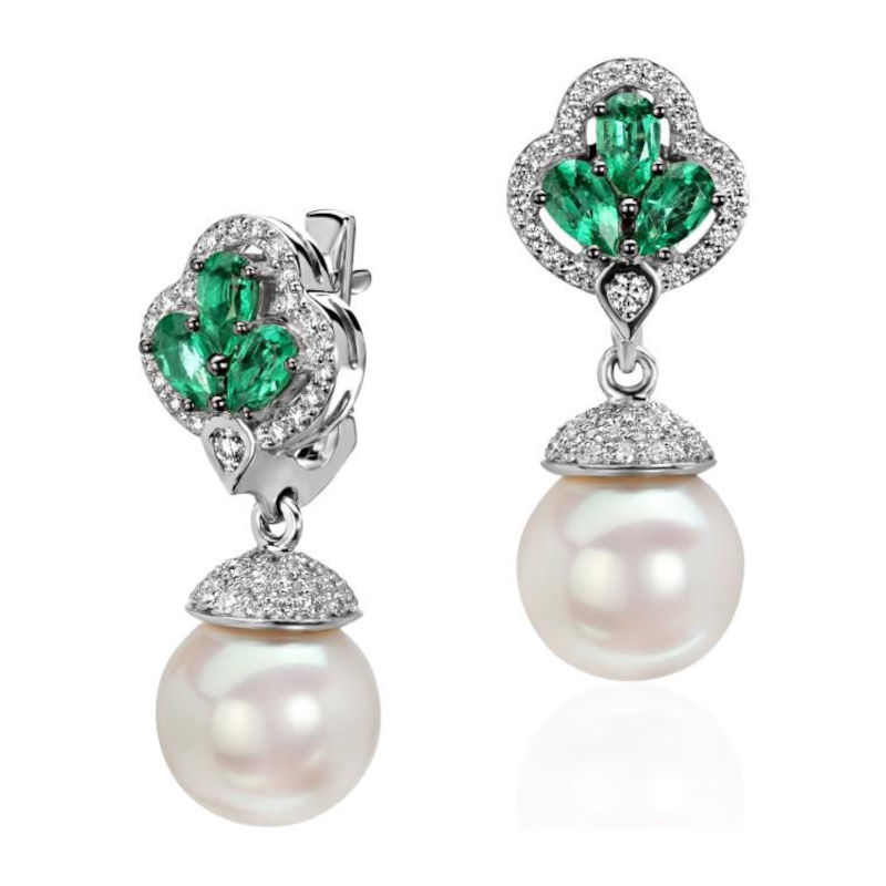 Серьги из белого золота 585 пробы с жемчугом, бриллиантами и изумрудами 01С6210177-2