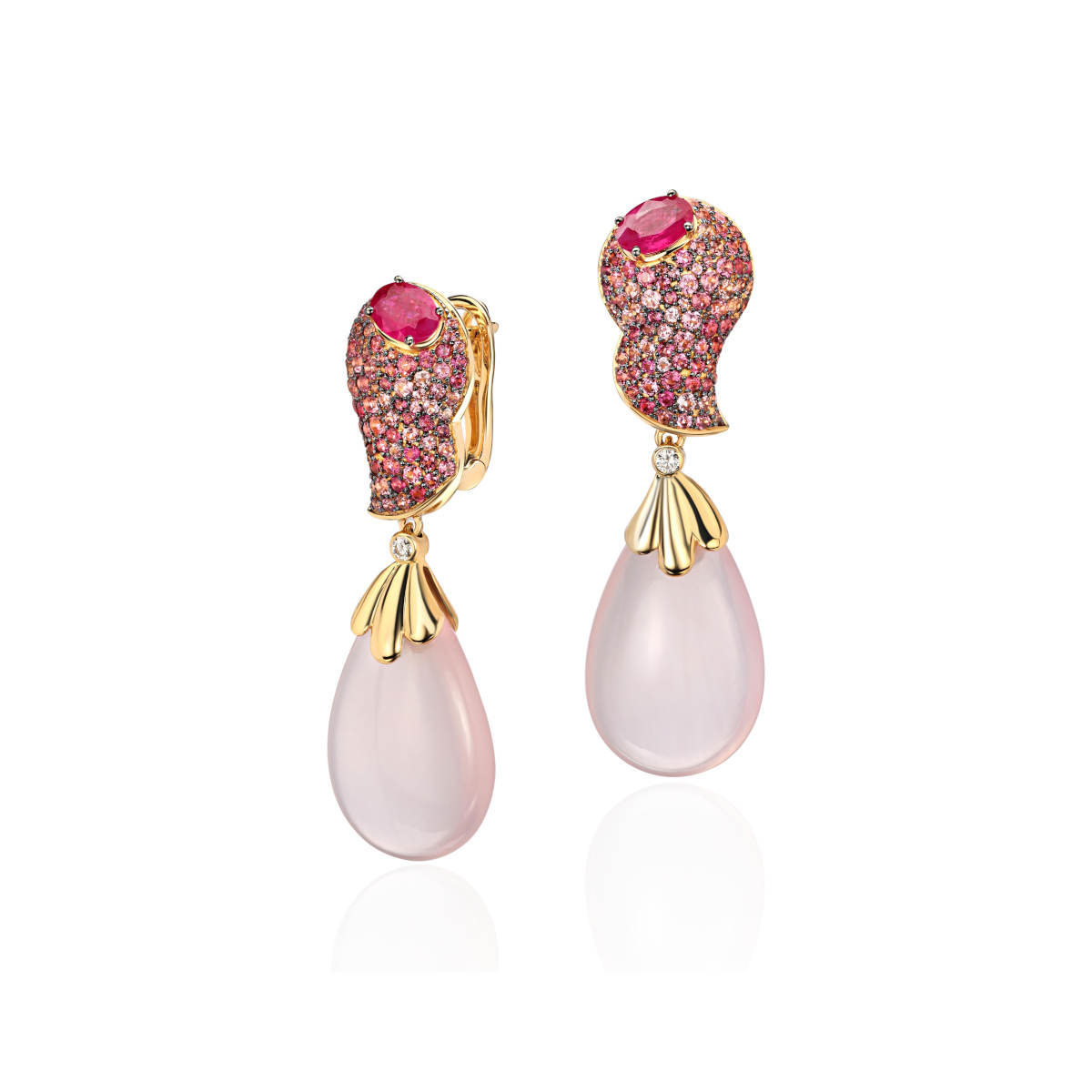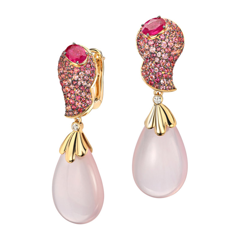 Серьги из желтого золота 585 пробы с турмалинами, рубинами, кварцем и бриллиантами 01С6314475-1