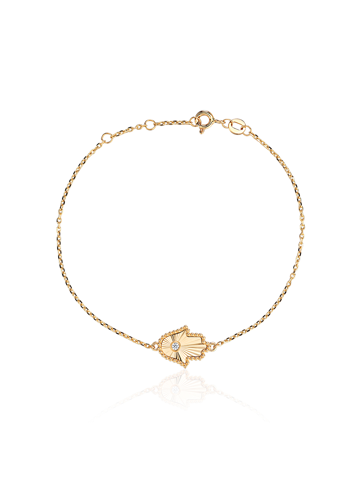 Браслет из желтого золота 585 пробы 01Б133377 украшен фианитом, который добавляет изделию особого блеска и элегантности. Главный акцент — символ "рука Фатимы", или амулет Хамса, выполненный в виде вставки, который придает украшению не только красоту, но и глубокий смысл. Хамса считается мощным оберегом, защищающим от негативных воздействий, зависти и злых взглядов. Этот символ широко распространен в культурах Ближнего Востока, а также и других регионов, символизируя защиту, благополучие и здоровье. Маленький, но сильный талисман, он способствует внутренней гармонии и укрепляет веру в добро.