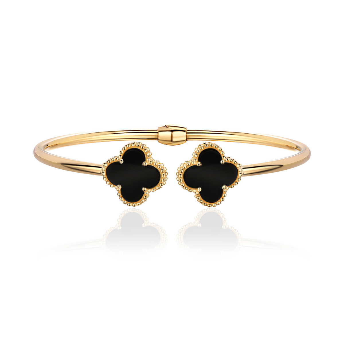 Браслет "Клевер" 01Б412901-1 выполнен из красного золота 585 пробы и украшен черными агатами в виде клевера. Браслет представляет собой жесткую конструкцию без застежки, что делает его удобным и комфортным в ношении. Цветы клевера размером 16х16 мм символизируют удачу. Черный агат считается камнем защиты и энергетической силы, он помогает сосредоточиться, уменьшить стресс и защищает от негативных воздействий. Браслет отлично сочетается с серьгами, кулоном или кольцом с таким же клевером, позволяя создавать гармоничные комплекты. Каждое изделие поставляется в подарочной коробке и фирменном бумажном пакете, что делает его идеальным подарком для близких и любимых.