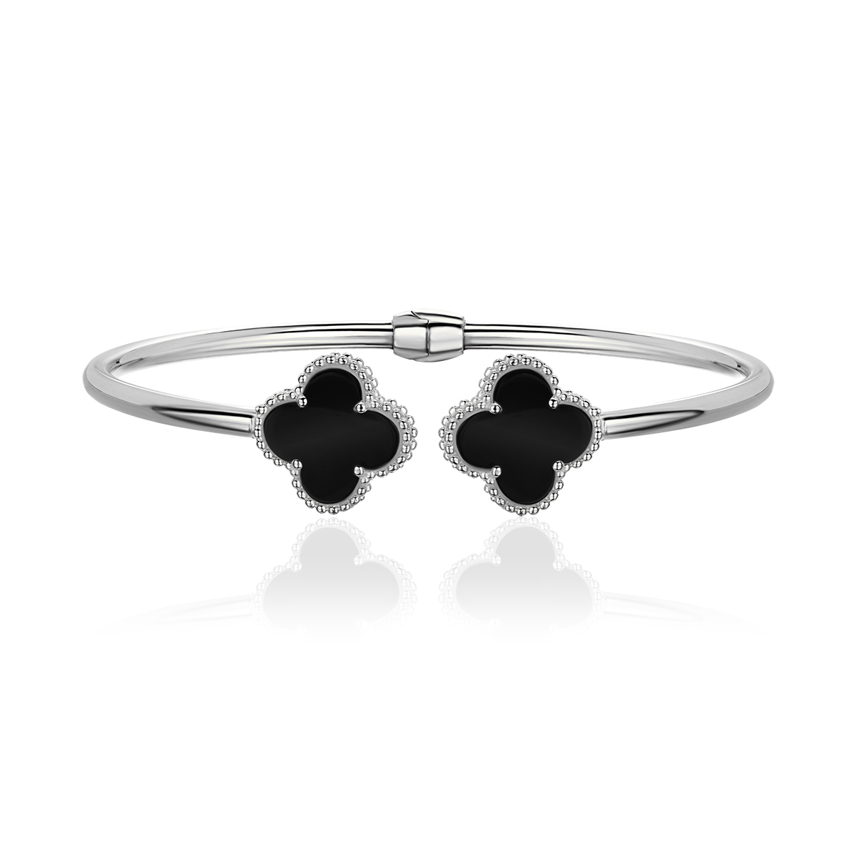 Браслет "Клевер" из белого золота 585 пробы с агатами — это выразительное украшение, которое подчеркнет вашу индивидуальность и изящность. Жесткий браслет с конструкцией в стиле конго удобно и надежно ложится на запястье, создавая элегантный силуэт. Основной декоративный элемент — вставка из агата черного цвета в форме клевера, которая добавляет изделию особую символическую значимость. Агат считается камнем защиты, гармонии и внутренней силы, а его черный оттенок ассоциируется с силой и тайной мудростью. В форме клевера он символизирует удачу, счастье и благополучие, принося позитивные энергии своему владельцу.