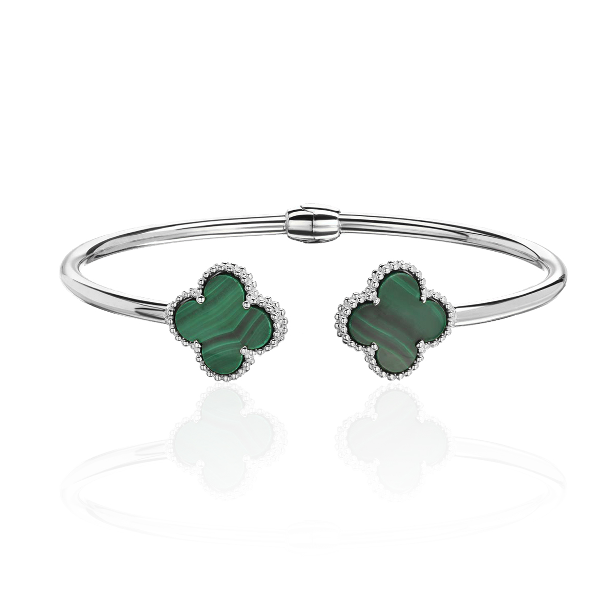 Браслет "Клевер" из белого золота 585 пробы с малахитами — выразительный и символичный аксессуар. Жесткий браслет конго идеально облегает запястье, создавая элегантный и современный образ. Главный акцент — вставка в виде клевера из насыщенного зеленого малахита. В его формировании использован натуральный камень с характерным глубоким оттенком и красивой структурой, что подчеркивает уникальность каждого изделия. Малахит считается камнем удачи, гармонии и внутреннего баланса, его зеленый цвет символизирует рост, возрождение и жизненную энергию. В форме клевера он приобретает особое значение как талисман, приносящий удачу, счастье и благополучие своему владельцу.