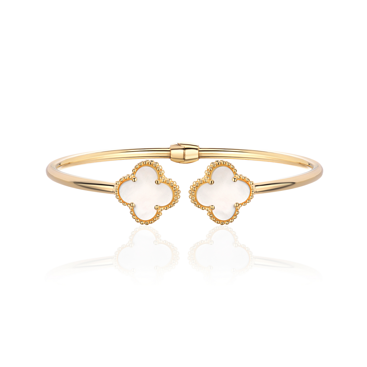 Браслет “Клевер” изготовлен из утонченного желтого золота 585 пробы и украшен перламутром в форме четырехлистного клевера, который издревле считается символом удачи, гармонии и балансировки энергии. Нежный блеск перламутра придает изделию особую глубину и воздушность, создавая эффектный контраст с золотом.