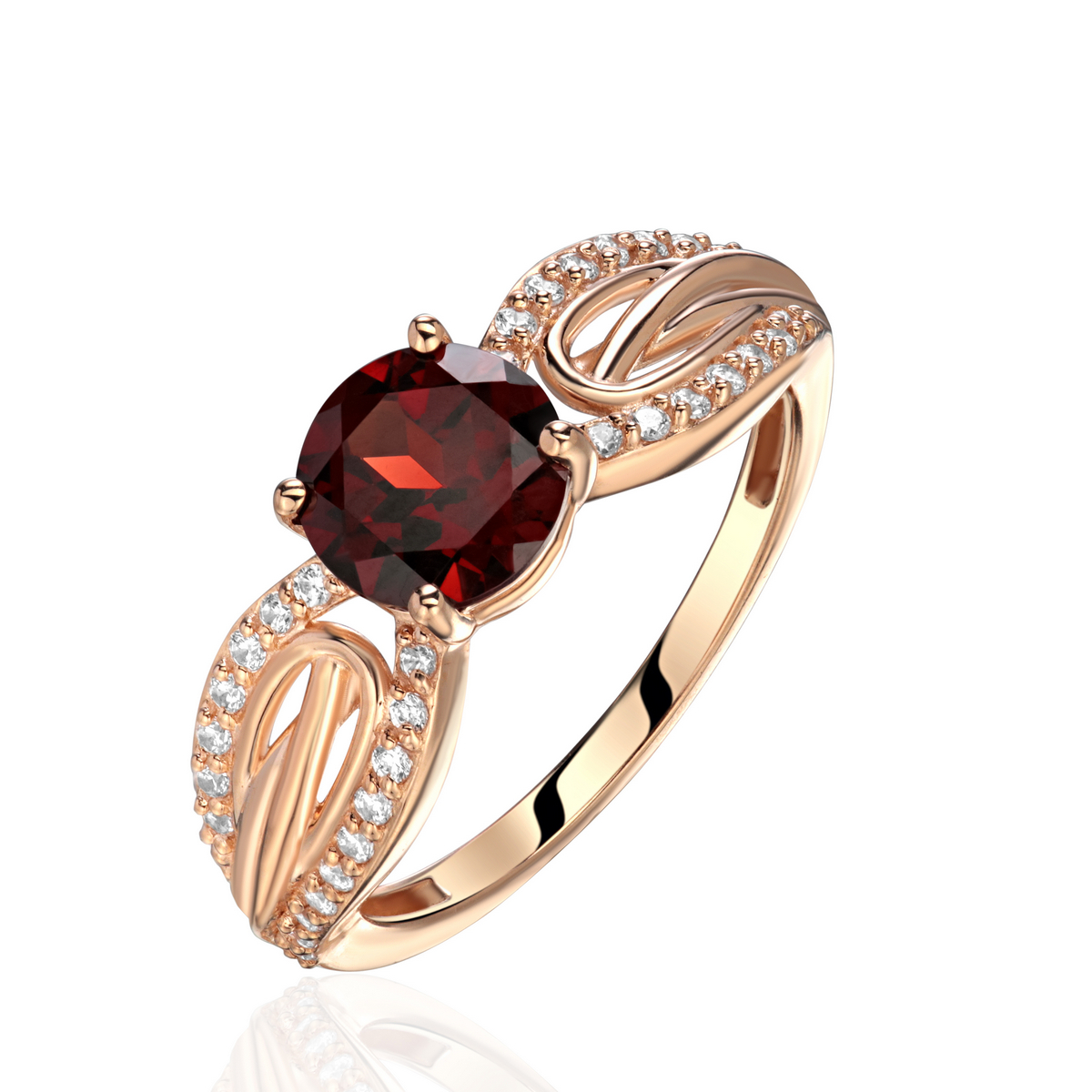 Кольцо из красного золота 585 пробы украшено ярким гранатом и мягким сиянием фианитов, создавая элегантное и выразительное сочетание. Каждая деталь изделия тщательно продумана, что делает его универсальным украшением для любого образа. Надев такое кольцо, вы подчеркнете свою индивидуальность и утонченный вкус.