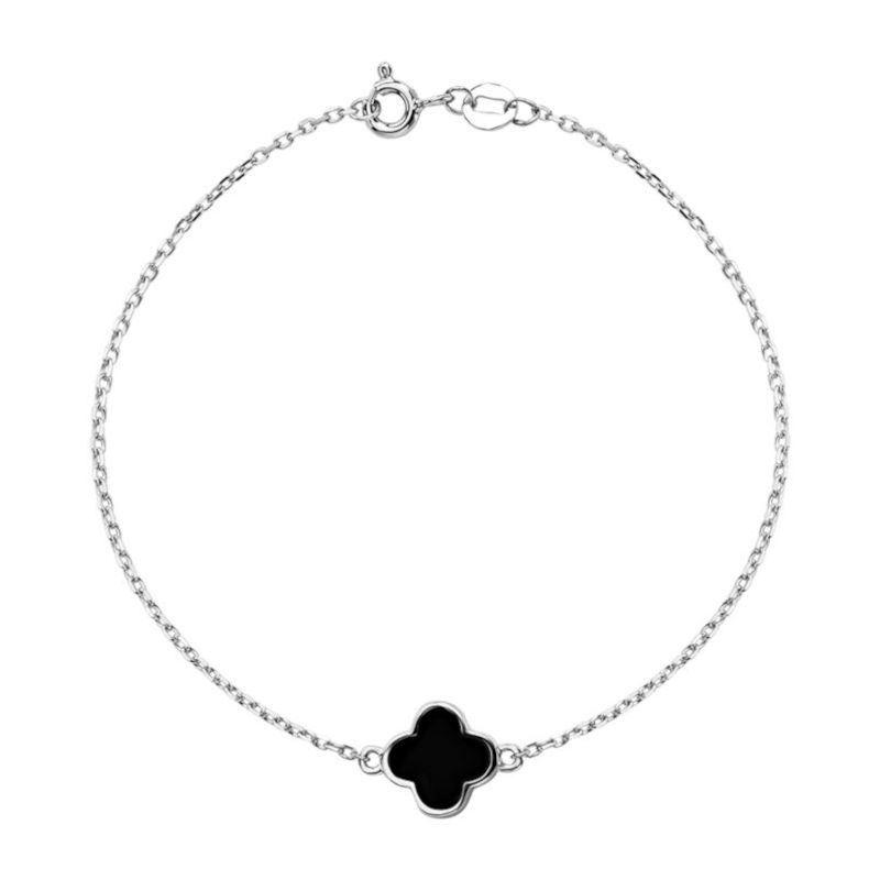 Этот женский браслет изготовлен из белого золота 585 пробы, украшенного изображением клевера, покрытого черной эмалью. Такое сочетание создает эффектный контраст и придает изделию особую выразительность. Родиевое покрытие обеспечивает дополнительную защиту и сохраняет яркость и блеск украшения на долгое время. Надежный шпрингельный замок делает застежку удобной и безопасной в использовании.