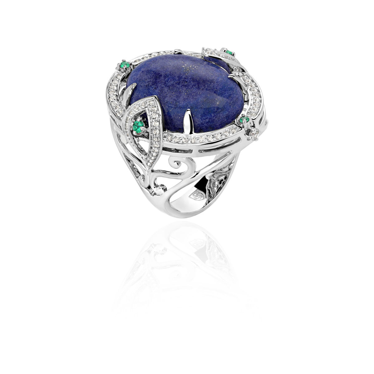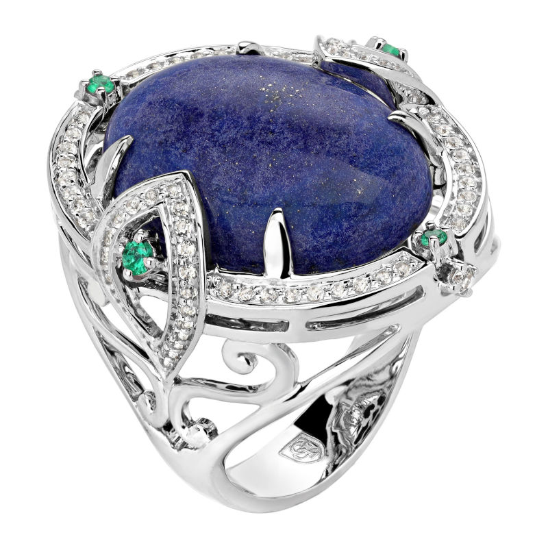 Кольцо из белого золота 585 пробы с лазуритом, топазами и изумрудами 01К5214113-1