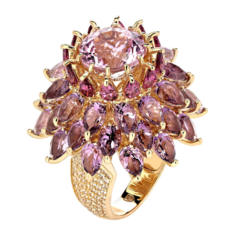 Кольцо из желтого золота 750 пробы с кунцитом, сапфирами, родолитами и аметистами 01К547998-3