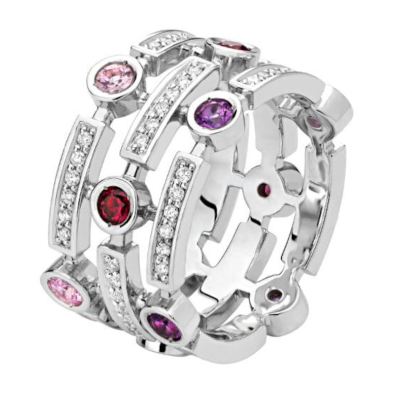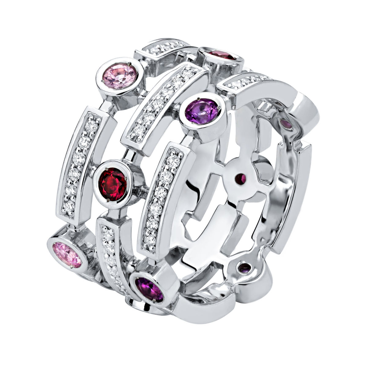 Кольцо из белого золота 585 пробы с аметистами, сапфирами, рубинами и бриллиантами 01К6212020-1