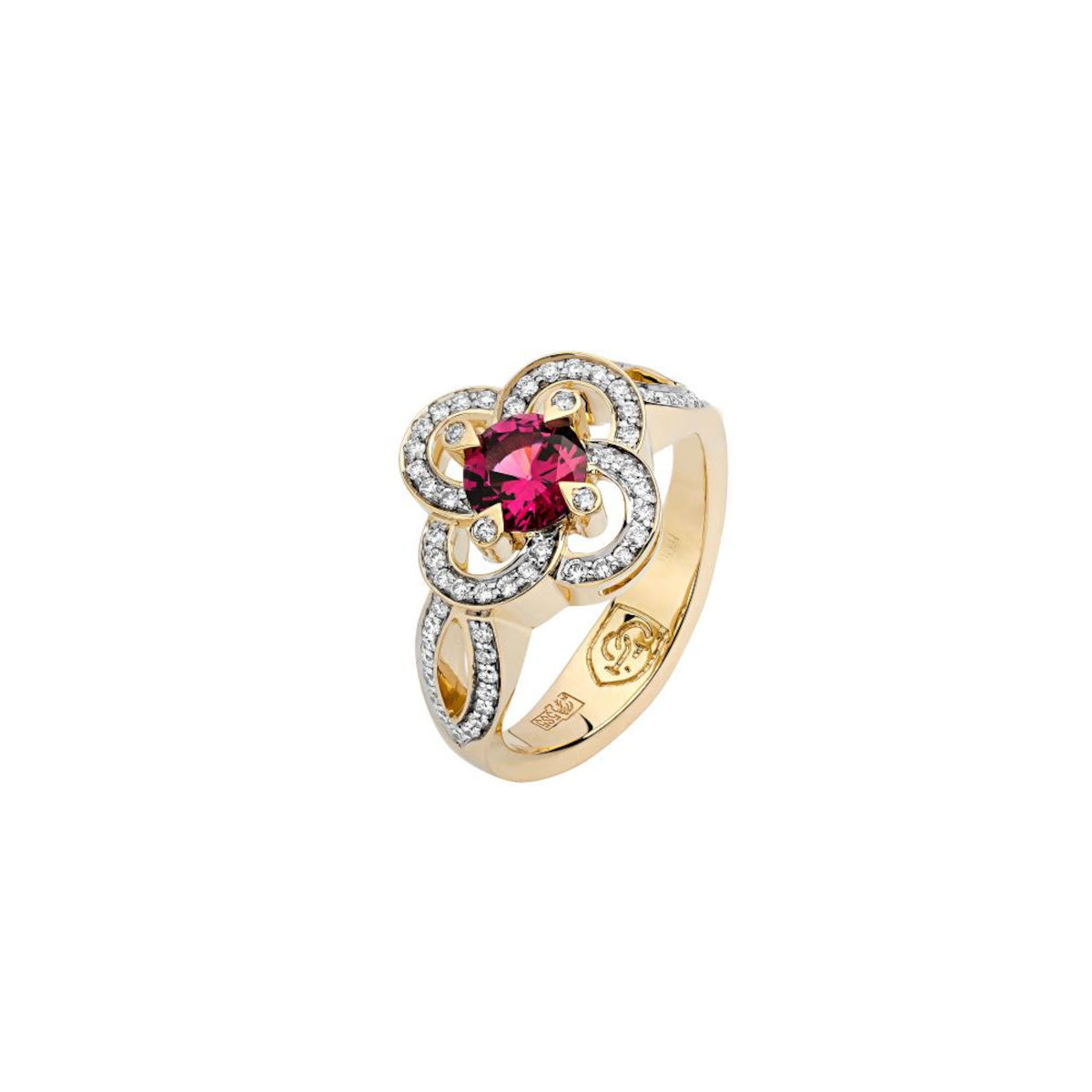 Кольцо из желтого золота 585 пробы с родолитом и бриллиантами 01К6311106-2