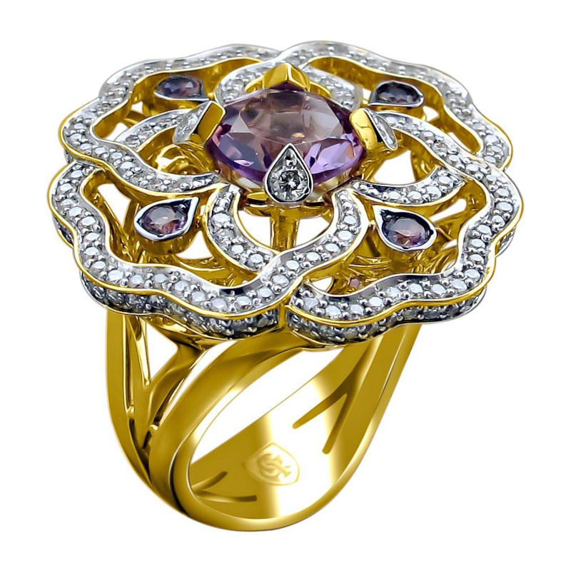 Кольцо из желтого золота 750 пробы с аметистами и бриллиантами 01К647987-7