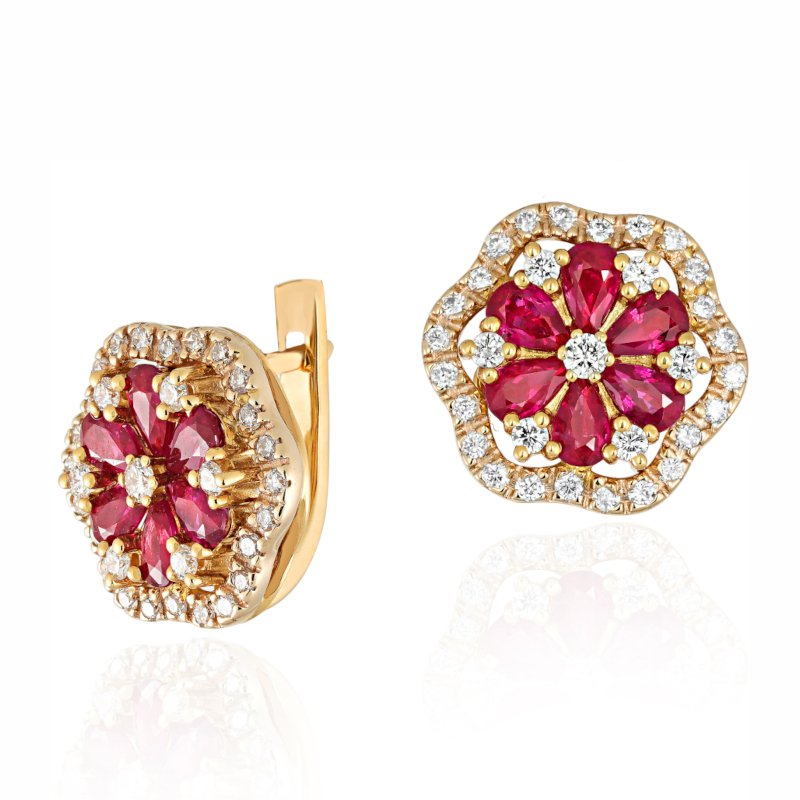 Серьги-цветы из комбинированного золота 750 пробы с рубинами и бриллиантами — часть премиальной коллекции Garden. Каждый лепесток великолепного цветка — это рубин огранки «груша», сияющий ярче в окружении прозрачных природных бриллиантов. Все камни тщательно подобраны по цвету и качеству огранки, чтобы создать украшение высокого стиля, совершенное по форме.