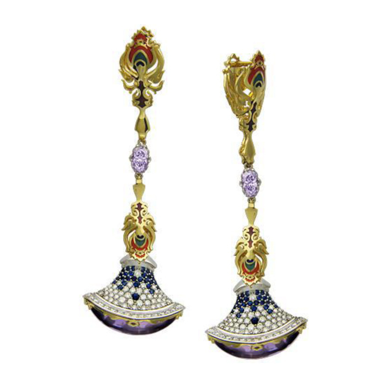 Серьги из комбинированного золота 750 пробы с бриллиантами, сапфирами, аметистами и эмалью 01С684729Э-1