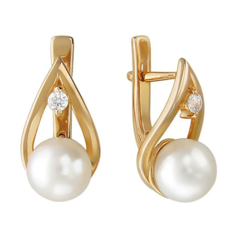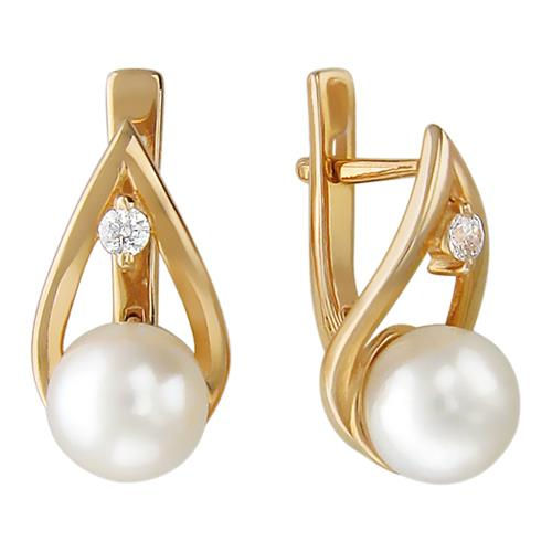 Серьги из красного золота 585 пробы с фианитами и жемчугом 01С312993-1