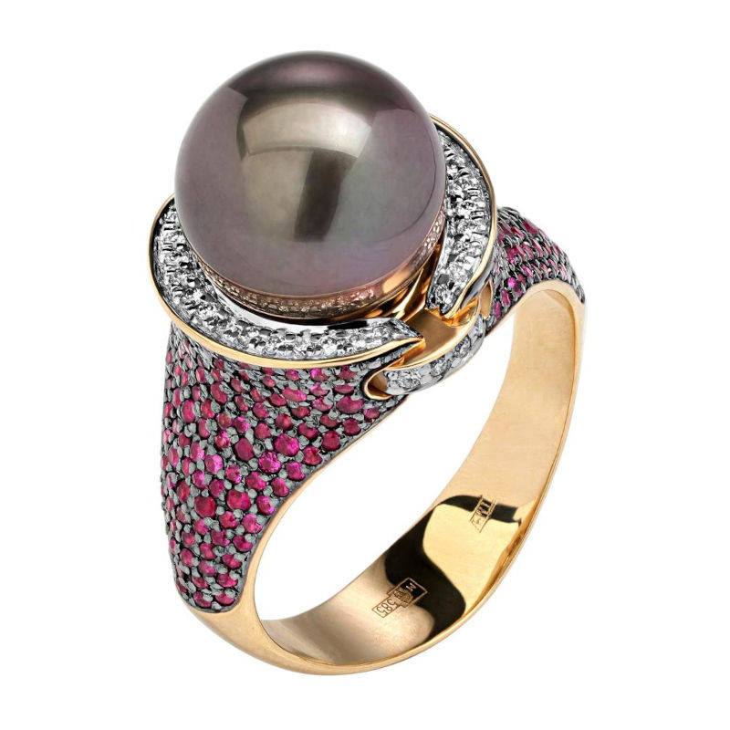 Кольцо из желтого золота 585 пробы с жемчугом, рубинами и бриллиантами 01К6311523-1