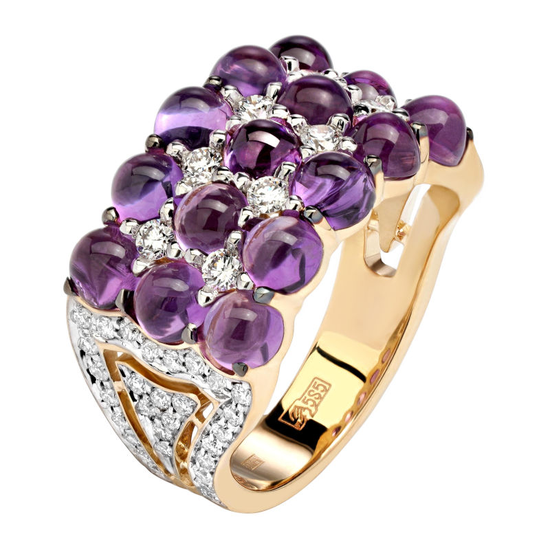 Кольцо из желтого золота 585 пробы с аметистами и бриллиантами 01К6311755-1