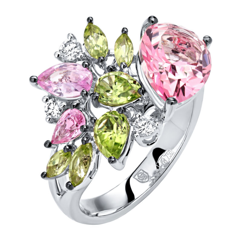 Кольцо из белого золота 750 пробы с хризолитами, топазом, сапфирами и бриллиантами 01К6713251-4