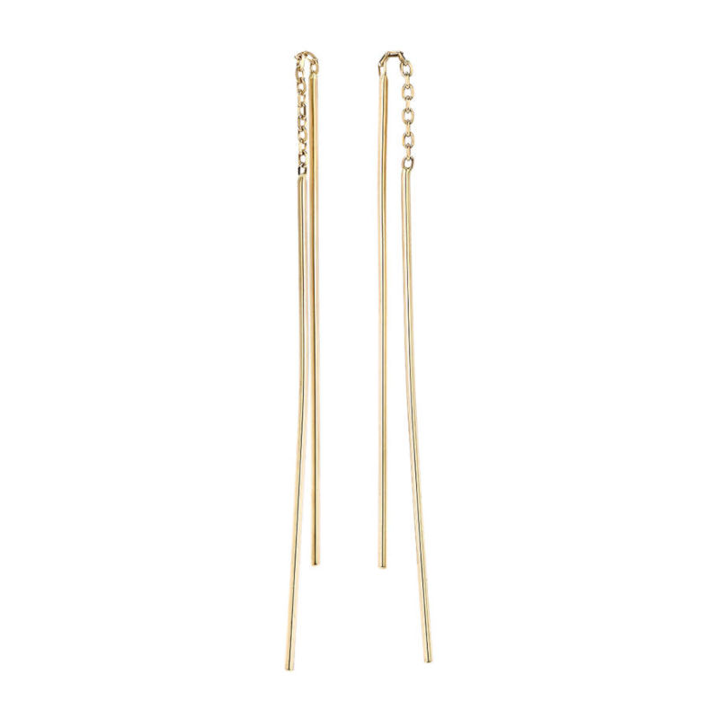 Тоненькие, невесомые серьги-цепочки из желтого золота 585 пробы без вставок с алмазной гранью привлекут внимание к изяществу Вашей шеи и будут отлично смотреться с любым нарядом. Удобная конструкция без замков. В украшении много воздуха и движения.