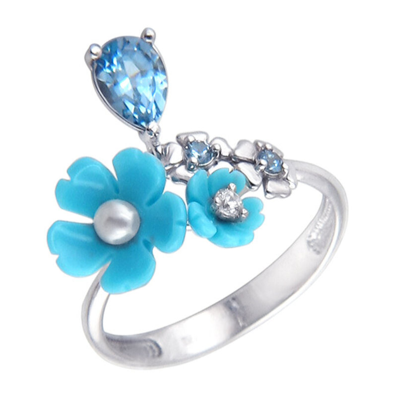 Кольцо из серебра 925 пробы с фианитом, шпинелью, нанотопазом, имитацией бирюзы и жемчугом 01К3511204-1 - это изысканное ювелирное изделие, созданное для женщин.