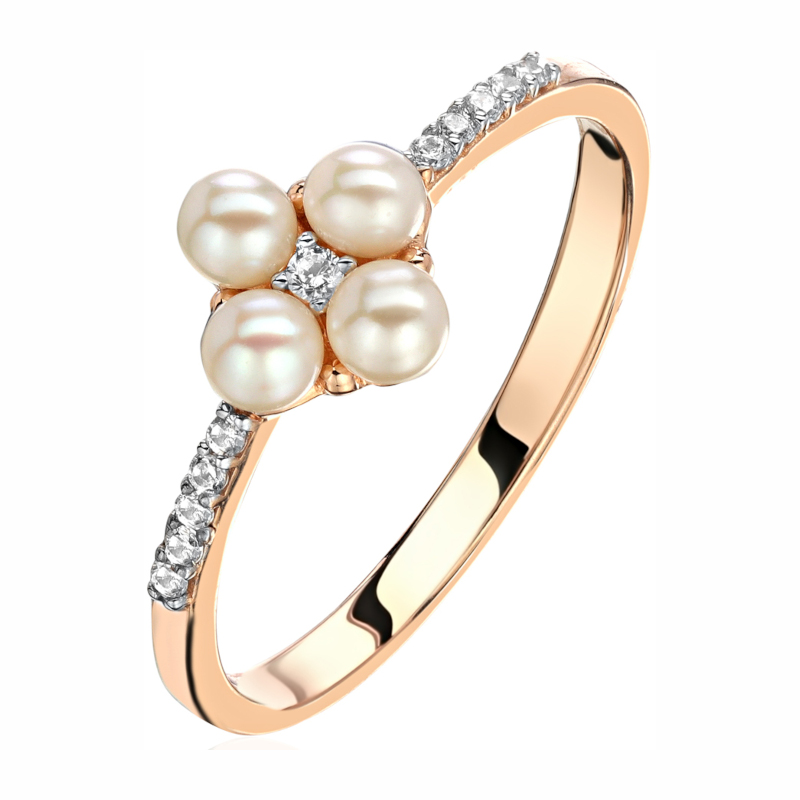 Кольцо из красного золота 585 пробы с фианитами и жемчугом 01К3114284-1