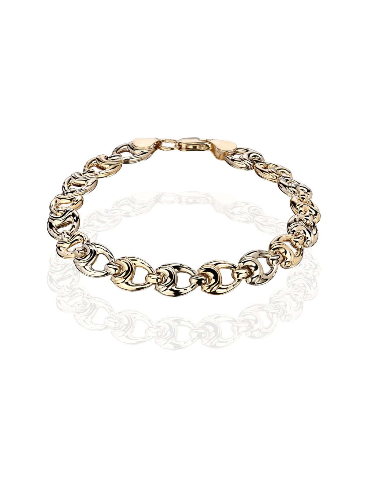 Браслет из двух цветов золота — желтого и белого, выполненный из металлов 585 пробы без вставок — станет стильным акцентом любой коллекции украшений. Благодаря технологии штампования, этот дизайн обладает легким весом, несмотря на обширную внешнюю поверхность. Такой метод позволяет добиться исключительной гармонии формы и потерять в весе без потери объема и визуальной насыщенности изделия.