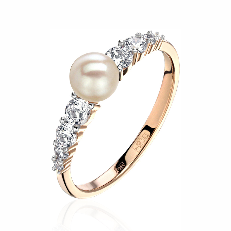 Кольцо из красного золота 585 пробы с фианитами и жемчугом 01К3115385Р-1