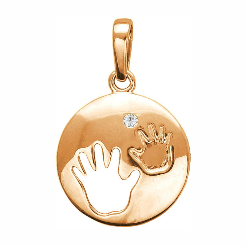 Подвеска из красного золота 585 пробы с фианитом 01П113582 станет элегантным дополнением любого образа. Ее круглая форма украшена отпечатком двух ладошек — побольше и поменьше — символизирующим тепло, заботу и близость. Нежный светлый фианит добавляет украшению изысканности и блеска.