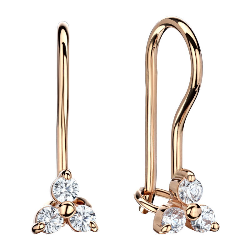 Детские серьги из красного золота 585 пробы с фианитами. Для детей мы предлагаем все самое лучшее и безопасное. Детские серьги не имеют острых деталей, а замок надежно удерживает их в детских ушках. Родители могут быть спокойны за своих маленьких красавиц. Не стоит волноваться за надежность замка петля. Серьги находятся в ухе и не выпадают за счет баланса сережек. Загибаясь петлей, дужка опускается ниже мочки. Массы металла с обратной стороны уха достаточно, чтобы удерживать лицевую композицию. Имеется стопорный крючок, удерживающий петлю от расстегивания. Серьги легко надеваются, подходят для любой мочки уха. Фианит здесь как капелька росы - предвестник рассвета и приближающегося дня. Символизирует чистоту, свет, юность.