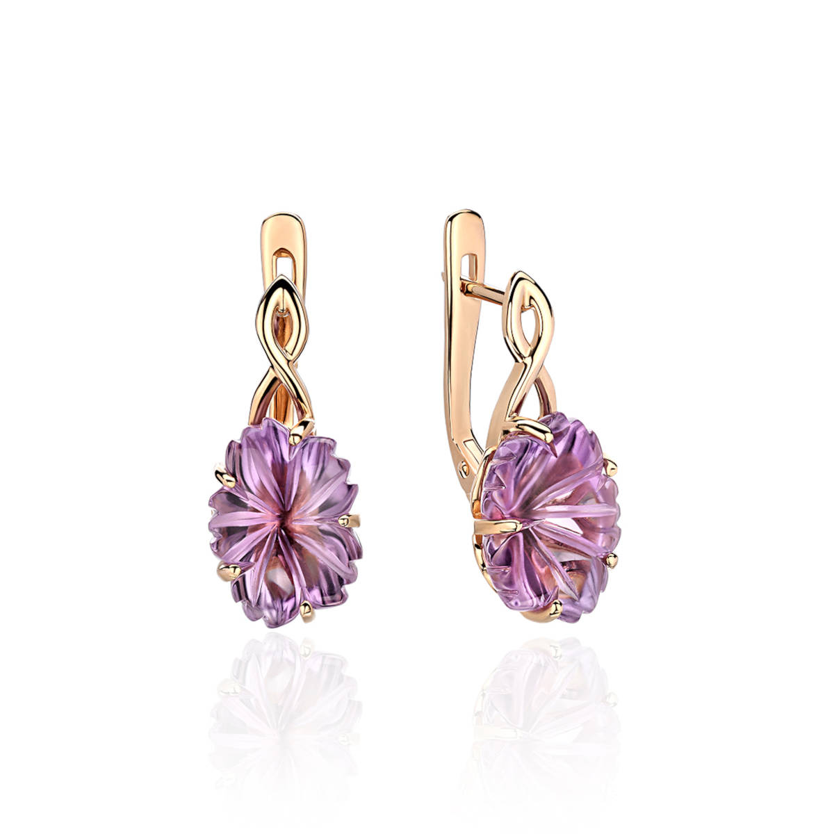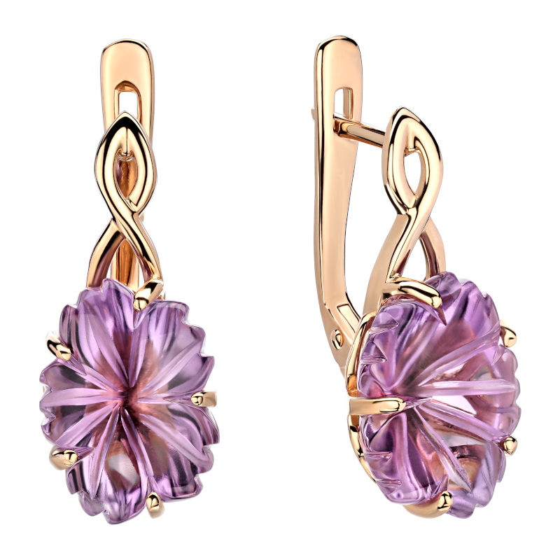 Серьги из красного золота 585 пробы с аметистами. Эксклюзивная огранка камня притягивает взоры. Необыкновенная форма, гладко отполированный верх и рельефная резьба низа требуют недюжинного мастерства огранщика и максимально раскрывают красоту камня, подчеркивая его достоинства – цвет, блеск, игру света, сияние.