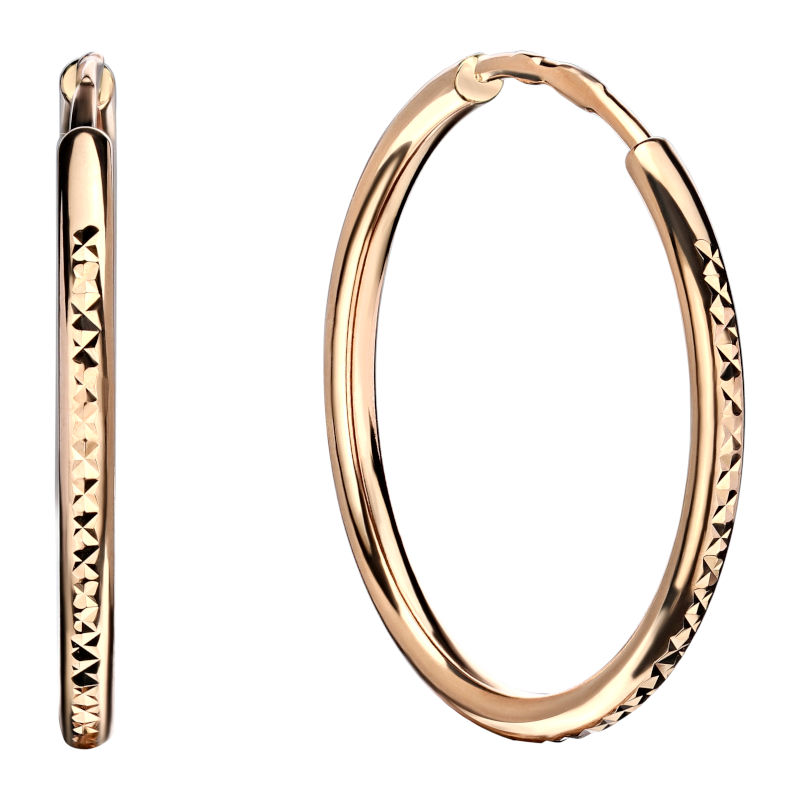 Серьги конго из красного золота 585 пробы с алмазной гранью необходимы для современных девушек. Классическая модель имеет форму гладкого обруча без вставок. Такие серьги изготавливаются полыми, что делает их очень легкими при внушительном размере.