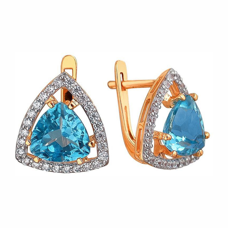 Серьги из золоченого серебра 925 пробы несут два ярко-голубых топаза в ореоле сверкающих фианитов. В огранке «триллион» акварельная чистота оттенка топаза раскрывается во всем блеске. Закрепка выполнена так, чтобы камень, как будто парил в воздухе, открывая грани свету. Серьги с топазами и фианитами надежно фиксируются английским замком.