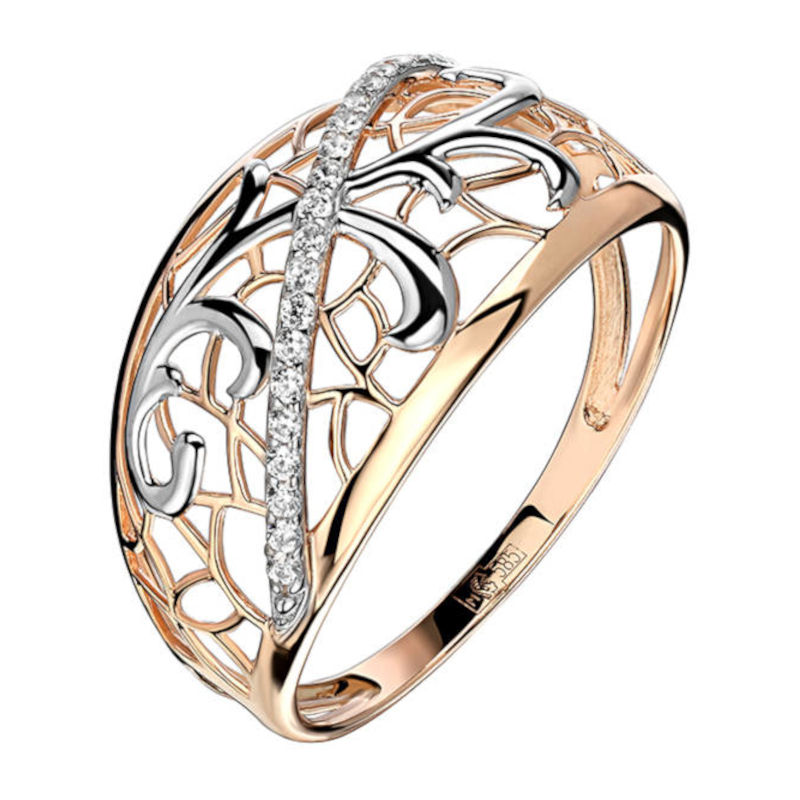 Кольцо из красного золота 585 пробы с декоративным дизайном. Сегодня сочетание золота и фианита уже считается классикой. Роскошный блеск фианита привлекает взгляды, а оригинальный дизайн вносит в образ нотку элегантности. Самые смелые решения дизайнеров воплощаются в современных украшениях. Покупая кольцо у нас, вы получаете не просто украшение, а настоящее произведение искусства, которое подчеркнет индивидуальность и стиль своей владелицы. Каждое кольцо тщательно разрабатывается нашими специалистами, что гарантирует высокое качество и долговечность.