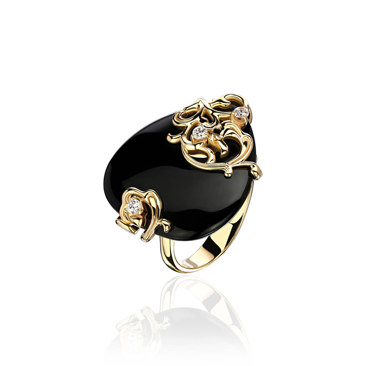 Кольцо из желтого золота 585 пробы с черным агатом и фианитами. Натуральные камни в обрамлении драгоценного металла несут в себе энергию, статус, цветотерапию. Украшение является инвестицией, так как вместе с драгоценным металлом используются натуральные вставки.