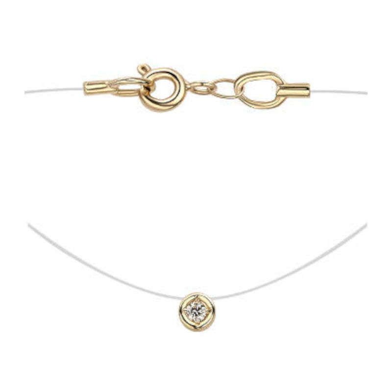 Необычное украшение – колье на леске-невидимке из желтого золота 585 пробы с бриллиантом. Визуальное впечатление отсутствия цепочки придает особую легкость и нежность Вашему образу. Невесомая, будто парящая в воздухе подвеска смотрится оригинально и очень изящно. В украшении много воздуха, свободы. Аксессуар подчеркнет одну из самых притягательных частей - женскую ключицу и плечи.