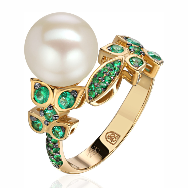 Кольцо из желтого золота 585 пробы с изумрудами и жемчугом 01К5311218-3