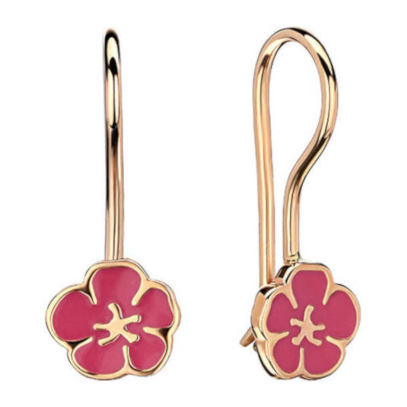 Детские серьги из красного золота 585 пробы с эмалью. Для детей мы предлагаем все самое лучшее и безопасное. Детские серьги не имеют острых деталей, а замок надежно удерживает их в детских ушках. Родители могут быть спокойны за своих маленьких красавиц. Не стоит волноваться за надежность замка петля. Серьги находятся в ухе и не выпадают за счет баланса сережек. Загибаясь петлей, дужка опускается ниже мочки. Массы металла с обратной стороны уха достаточно, чтобы удерживать лицевую композицию. Имеется стопорный крючок, удерживающий петлю от расстегивания. Серьги легко надеваются, подходят для любой мочки уха.