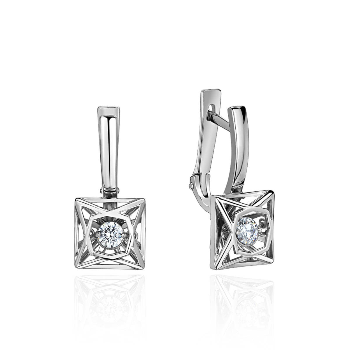 Серьги из белого золота 585 пробы с танцующими фианитами из коллекции Impulse. Уникальная закрепка в украшениях Impulse, пожалуй, прорыв во множестве традиционных вариантов закрепки камней. Точно выверенный баланс создан с таким расчетом, чтобы вставка приходила в движение, не переворачиваясь. Качания камня визуально ассоциируются с танцем. Лучи света каждый раз отражаются от разных граней вставки, превращаясь в радужные вспышки света. Это волшебство отражает всю красоту женщины.