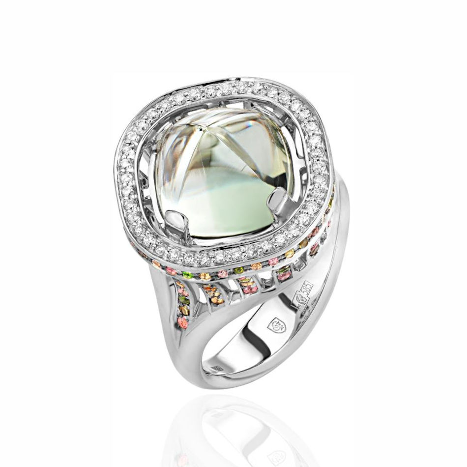 Кольцо из белого золота 585 пробы с празиолитом, бриллиантами и турмалинами 01К6211190-6