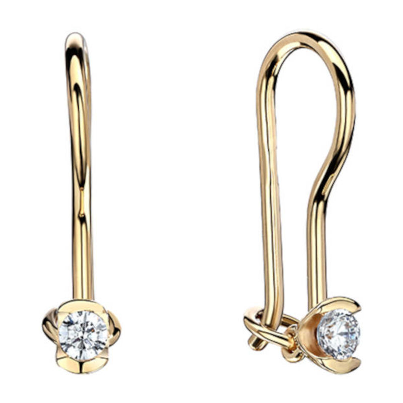Детские серьги из желтого золота 585 пробы с фианитами. Для детей мы предлагаем все самое лучшее и безопасное. Детские серьги не имеют острых деталей, а замок надежно удерживает их в детских ушках. Родители могут быть спокойны за своих маленьких красавиц. Не стоит волноваться за надежность замка петля. Серьги находятся в ухе и не выпадают за счет баланса сережек. Загибаясь петлей, дужка опускается ниже мочки. Массы металла с обратной стороны уха достаточно, чтобы удерживать лицевую композицию. Имеется стопорный крючок, удерживающий петлю от расстегивания. Серьги легко надеваются, подходят для любой мочки уха. Фианит здесь как капелька росы - предвестник рассвета и приближающегося дня. Символизирует чистоту, свет, юность.