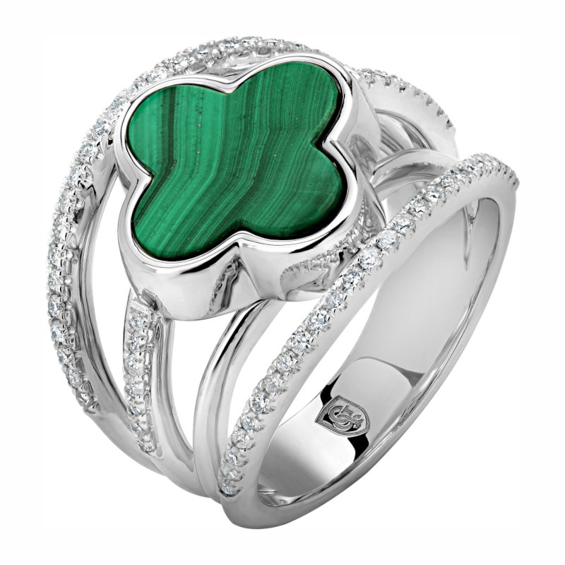 Кольцо из белого золота 585 пробы с малахитом и бриллиантами 01К6213310-1
