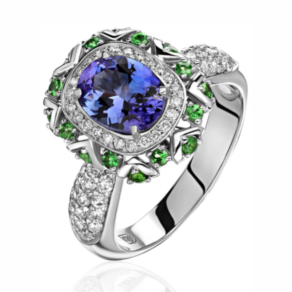 Кольцо из белого золота 585 пробы с танзанитом, бриллиантами и тсаворитами 01К6213535-6