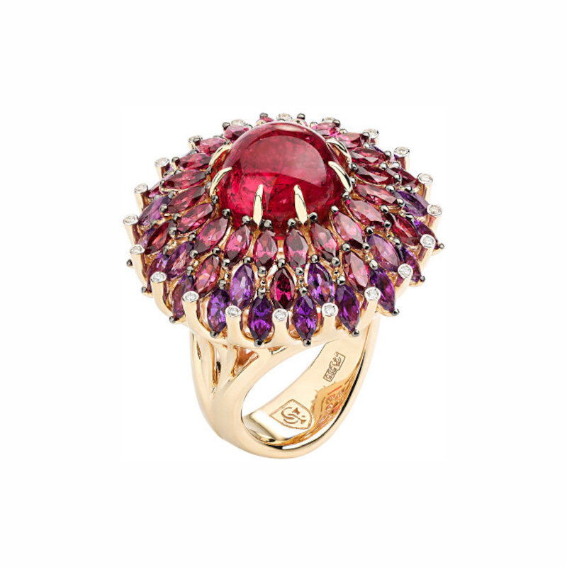 Кольцо из желтого золота 585 пробы с турмалинами, родолитами, гранатами и бриллиантами 01К6312320-1